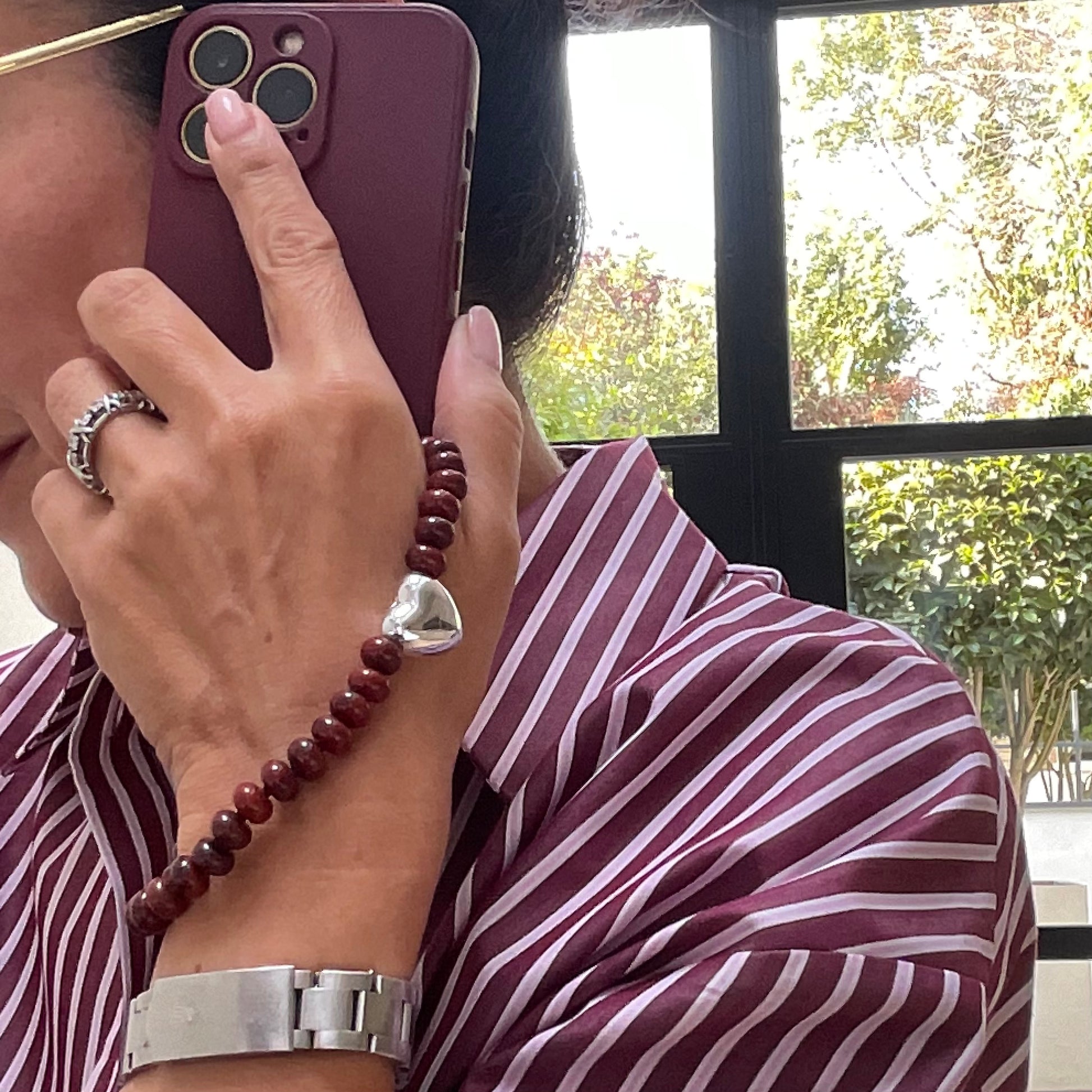 Add a touch of sparkle and personality to your phone with a handmade gemstone phone wristlet. Designed to combine beauty and utility, the Mimi wristlet features genuine gemstones strung on a durable nylon cord, forming a loop that slips comfortably over your wrist (approximately 30cm long).