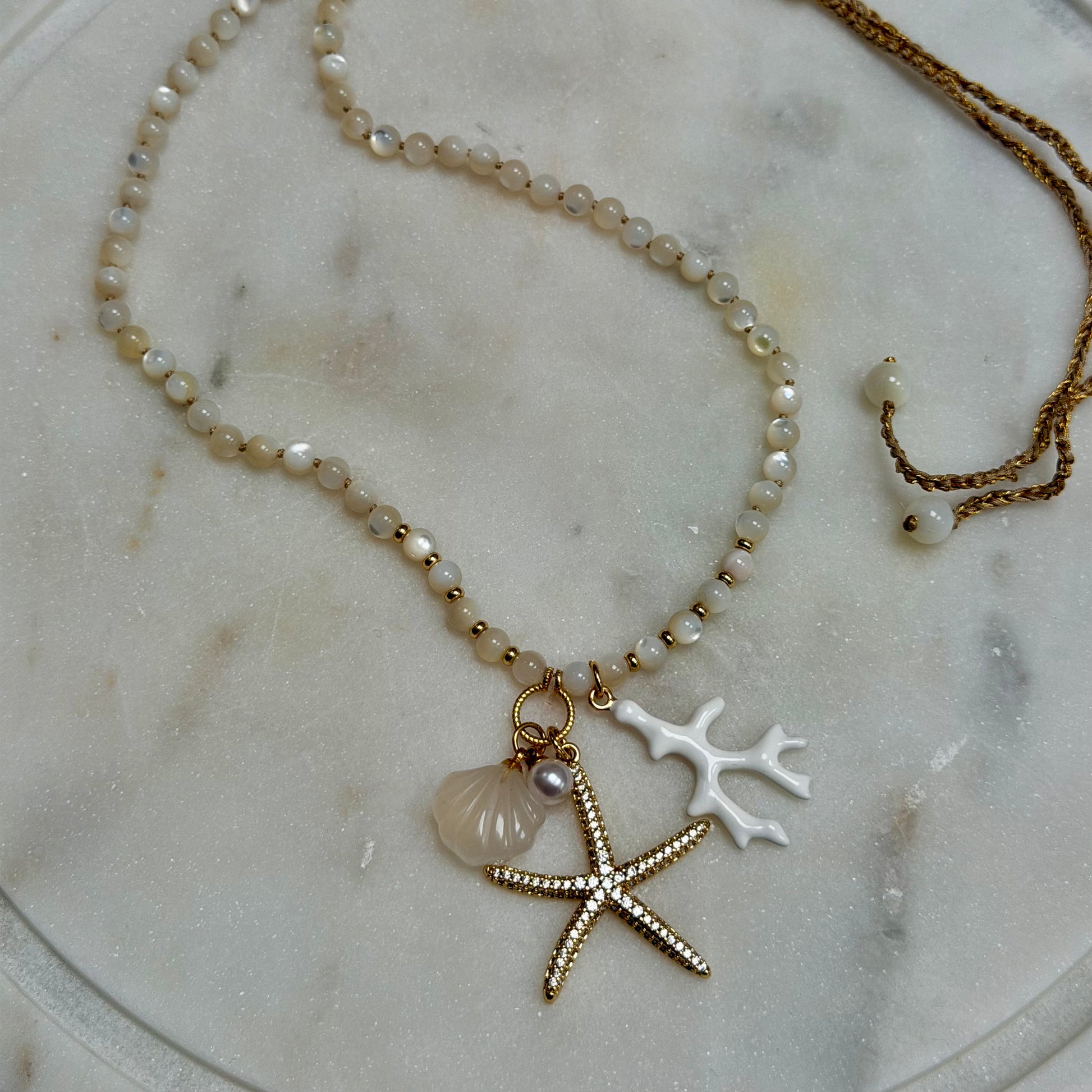 - A strand of hand knotted mother of pearl beads (approximately 3-4mm) with three seaside inspired charms