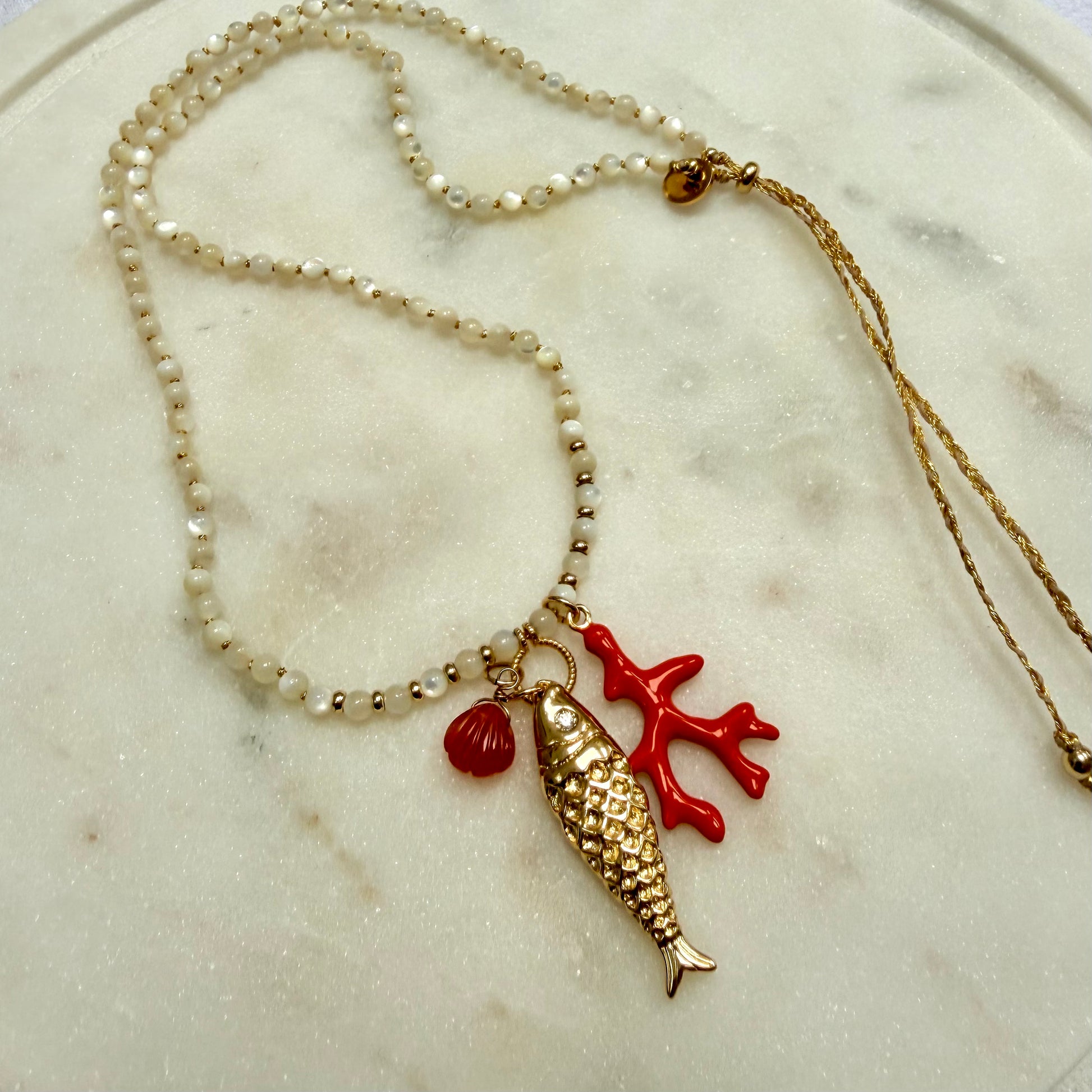 CORALIA, a long strand of shell pearls with three seaside inspired charms. She’s the summer necklace of dreams.