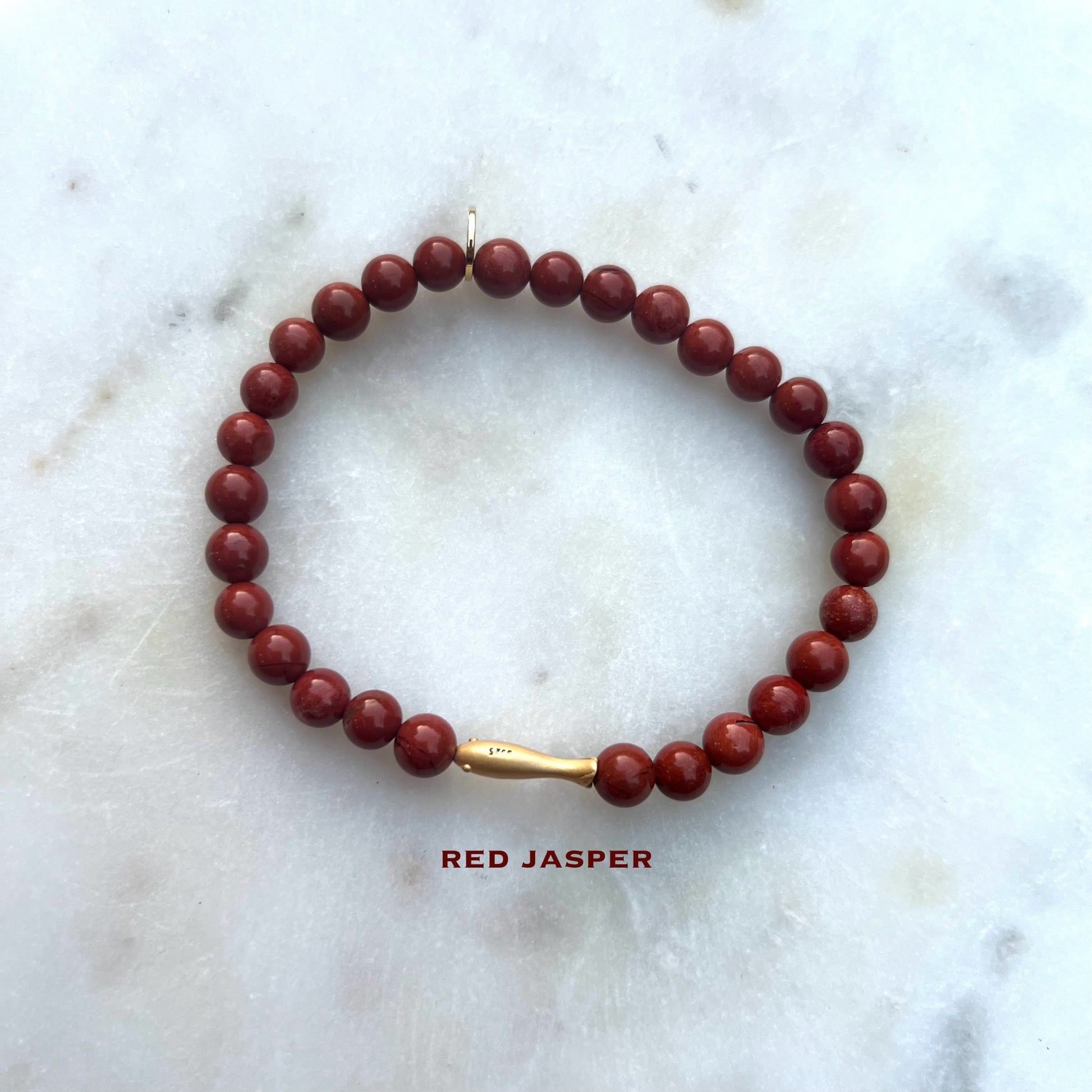 Attract flow and abundance with this minimal stretch bracelet made with smooth, 6mm natural red jasper beads (colour: terracotta/brick).