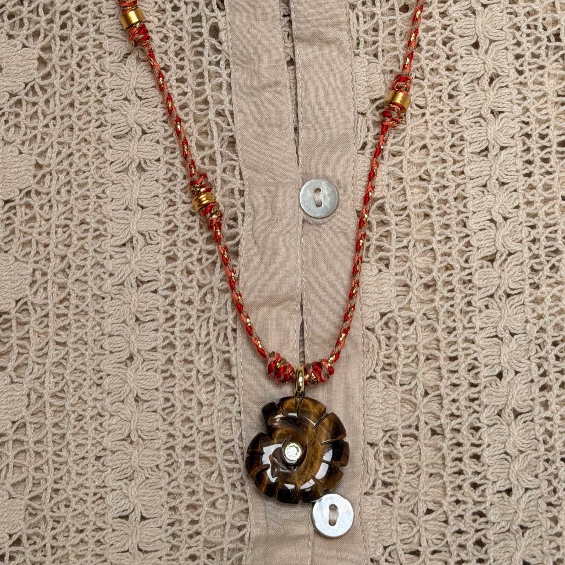 - Natural, hand carved gemstone conch shell pendant on a cotton cord.
